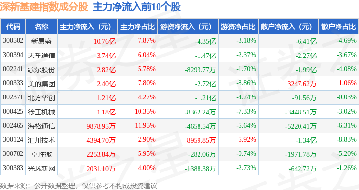 资金流向方面,深新基建(399274)指数成份股当日主力资金净流出合计46.44亿元,游资资金净流入合计11.67亿元,散户资金净流入合计34.78亿元。成份股资金流向详情见下表: