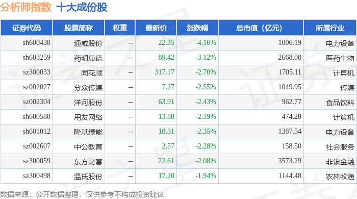 分析师指数(399354)十大成份股详情如下: