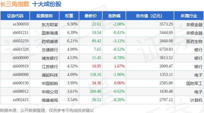 长三角(399355)指数十大成份股详情如下: