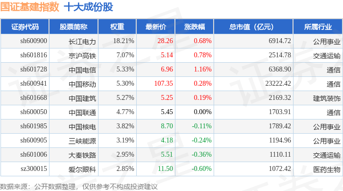 证券之星消息,12月2日,国证基建(399359)指数报收于2689.51点,涨0.21%,成交162.36亿元,换手率0.31%。当日该指数成份股中,上涨的有25家,江苏国信以1.28%的涨幅领涨,下跌的有18家,电投能源以1.67%的跌幅领跌。
