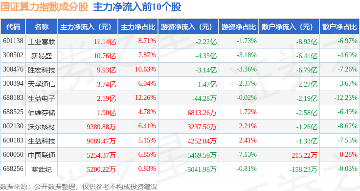 资金流向方面,国证算力(399363)指数成份股当日主力资金净流出合计39.24亿元,游资资金净流入合计19.9亿元,散户资金净流入合计19.34亿元。成份股资金流向详情见下表: