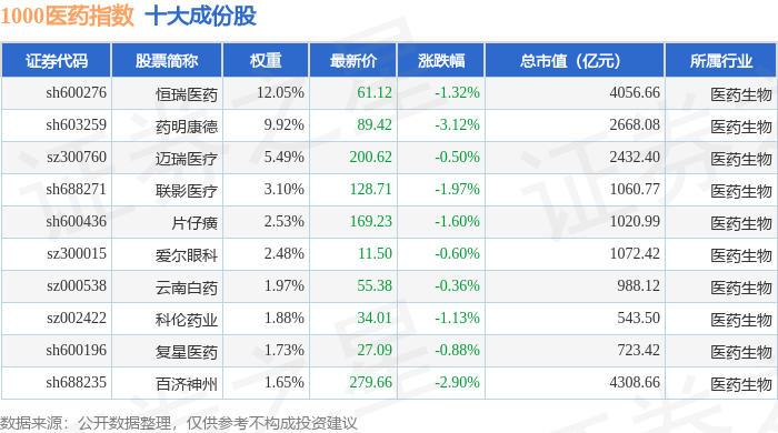 1000医药(399386)指数十大成份股详情如下: