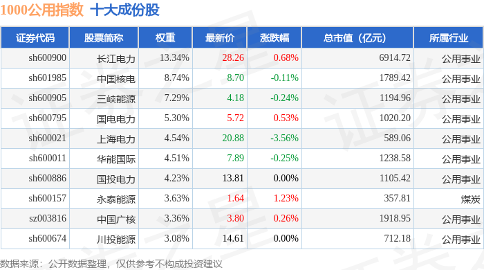 证券之星消息,12月2日,1000公用(399390)指数报收于2678.39点,涨0.05%,成交134.38亿元,换手率0.72%。当日该指数成份股中,上涨的有20家,内蒙华电以2.8%的涨幅领涨,下跌的有20家,上海电力以3.56%的跌幅领跌。