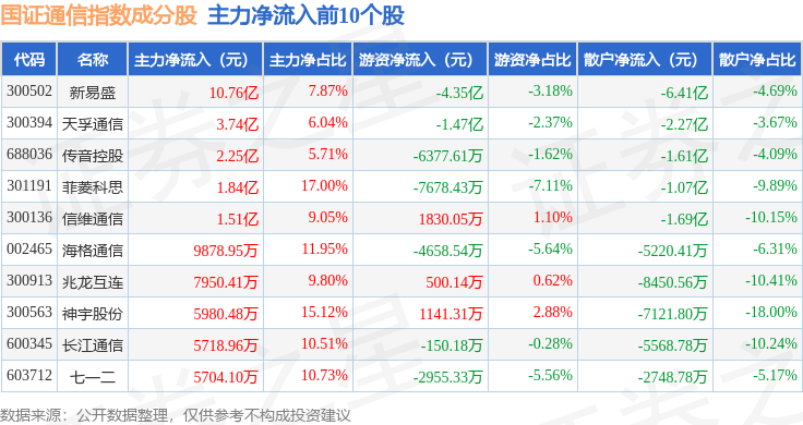 资金流向方面,国证通信(399389)指数成份股当日主力资金净流出合计48.61亿元,游资资金净流入合计14.67亿元,散户资金净流入合计33.95亿元。成份股资金流向详情见下表: