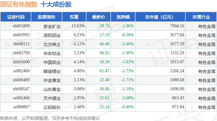 证券之星消息,12月2日,国证有色(399395)指数报收于8725.77点,跌1.43%,成交504.73亿元,换手率1.43%。当日该指数成份股中,上涨的有3家,华峰铝业以3.5%的涨幅领涨,下跌的有47家,雅化集团以4.19%的跌幅领跌。