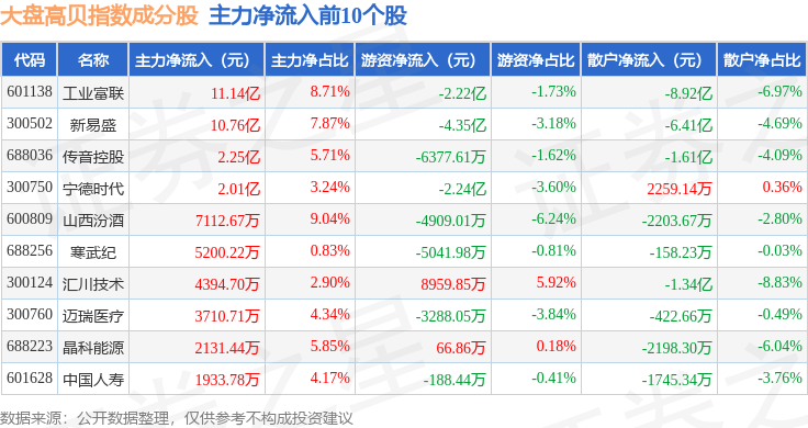 资金流向方面,大盘高贝(399405)指数成份股当日主力资金净流出合计68.89亿元,游资资金净流入合计22.27亿元,散户资金净流入合计46.62亿元。成份股资金流向详情见下表: