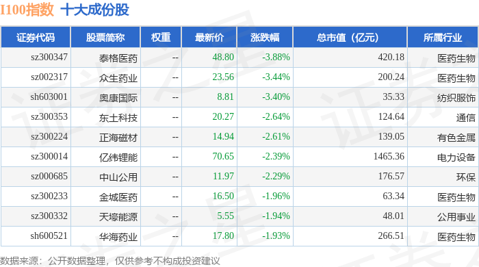 I100(399415)指数十大成份股详情如下: