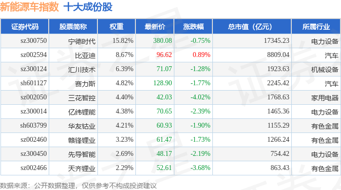 证券之星消息,12月2日,新能源车(399417)指数报收于3753.79点,跌1.35%,成交696.33亿元,换手率2.31%。当日该指数成份股中,上涨的有8家,星源材质以5.13%的涨幅领涨,下跌的有41家,鹏辉能源以5.0%的跌幅领跌。
