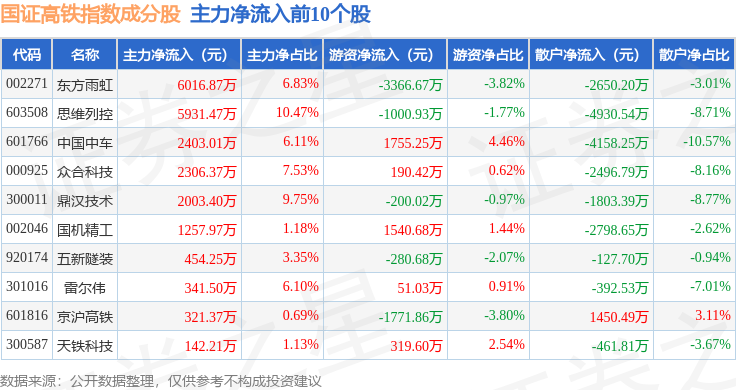 资金流向方面,国证高铁(399419)指数成份股当日主力资金净流出合计5.55亿元,游资资金净流入合计5837.09万元,散户资金净流入合计4.97亿元。成份股资金流向详情见下表: