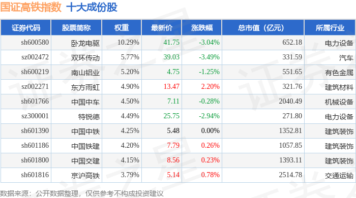 国证高铁(399419)指数十大成份股详情如下: