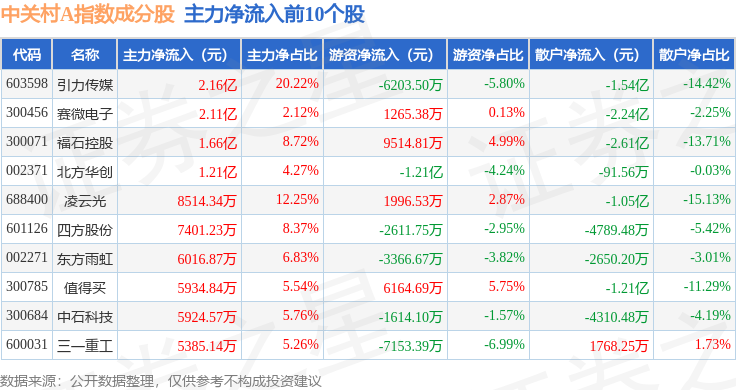 资金流向方面,中关村A(399422)指数成份股当日主力资金净流出合计52.63亿元,游资资金净流入合计14.35亿元,散户资金净流入合计37.22亿元。成份股资金流向详情见下表: