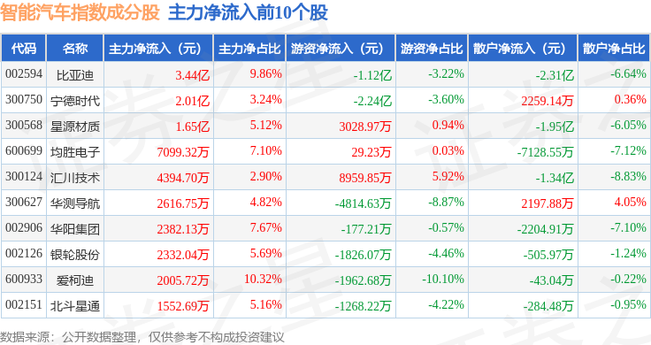 资金流向方面,智能汽车(399432)指数成份股当日主力资金净流出合计37.84亿元,游资资金净流入合计7.34亿元,散户资金净流入合计30.49亿元。成份股资金流向详情见下表: