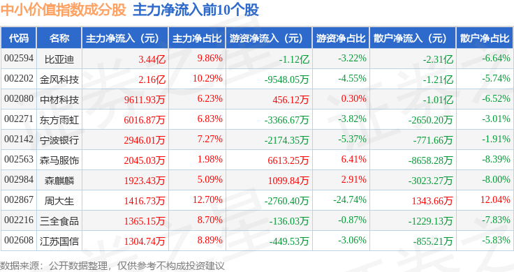 资金流向方面,中小价值(399604)指数成份股当日主力资金净流出合计12.56亿元,游资资金净流出合计5121.31万元,散户资金净流入合计13.07亿元。成份股资金流向详情见下表: