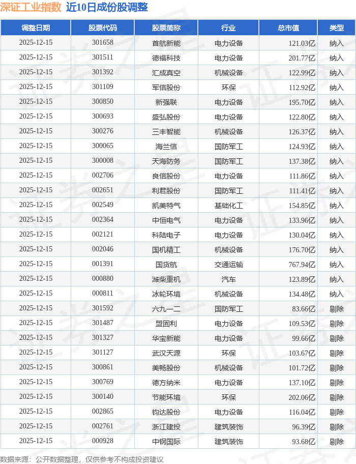 近10日内深证工业(399615)指数成份股做了调整,新纳入了18只股票,剔除了10只股票。