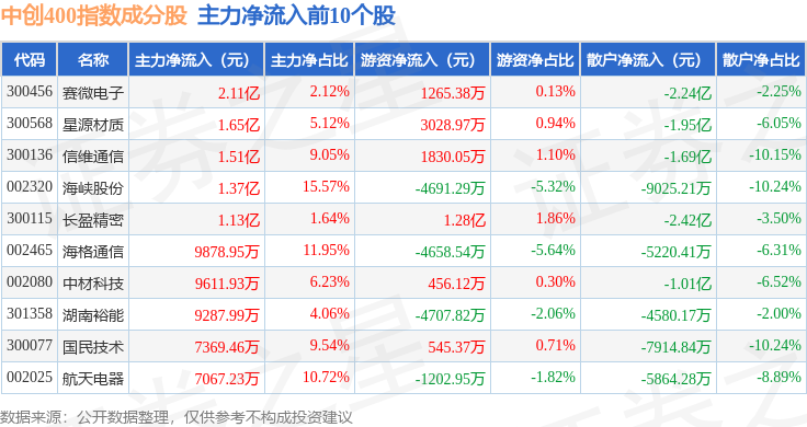 资金流向方面,中创400(399624)指数成份股当日主力资金净流出合计122.61亿元,游资资金净流入合计28.66亿元,散户资金净流入合计93.95亿元。成份股资金流向详情见下表: