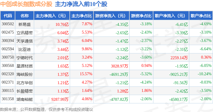 资金流向方面,中创成长(399626)指数成份股当日主力资金净流出合计67.43亿元,游资资金净流入合计7.95亿元,散户资金净流入合计59.48亿元。成份股资金流向详情见下表: