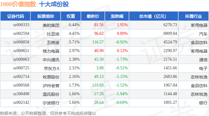 证券之星消息,12月2日,1000价值(399631)指数报收于2223.05点,跌0.36%,成交1243.42亿元,换手率1.08%。当日该指数成份股中,上涨的有112家,恒逸石化以10.05%的涨幅领涨,下跌的有206家,森马服饰以6.29%的跌幅领跌。