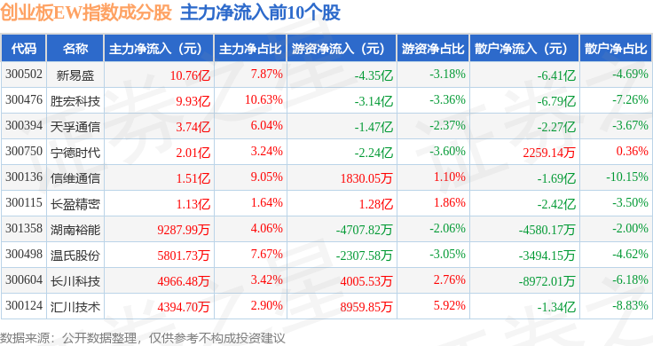 资金流向方面,创业板EW(399635)指数成份股当日主力资金净流出合计39.79亿元,游资资金净流入合计5.8亿元,散户资金净流入合计33.99亿元。成份股资金流向详情见下表: