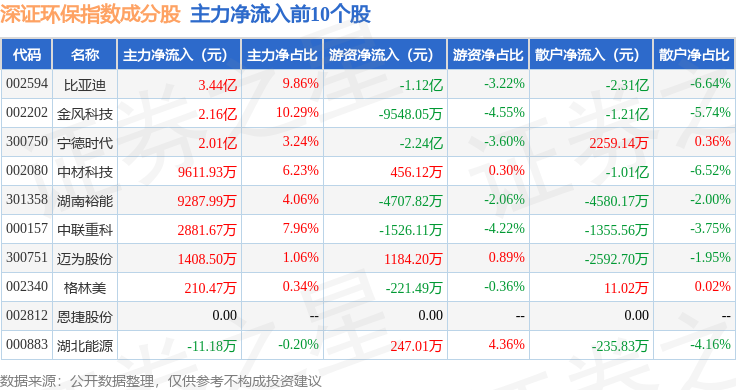 资金流向方面,深证环保(399638)指数成份股当日主力资金净流出合计22.36亿元,游资资金净流出合计4766.18万元,散户资金净流入合计22.83亿元。成份股资金流向详情见下表: