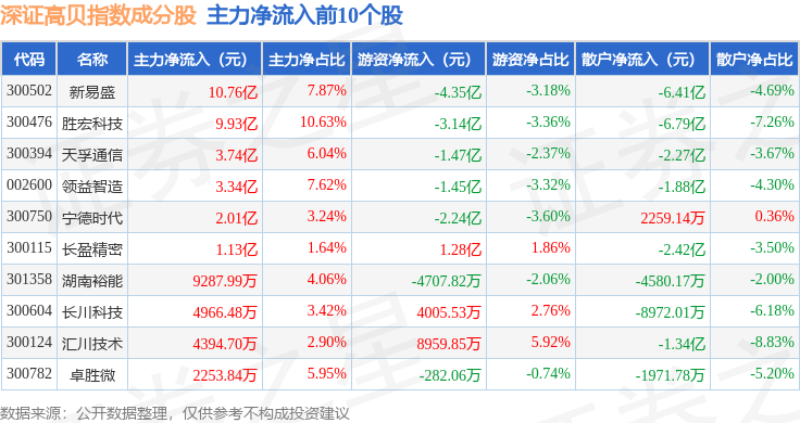 资金流向方面,深证高贝(399662)指数成份股当日主力资金净流出合计68.88亿元,游资资金净流入合计11.65亿元,散户资金净流入合计57.24亿元。成份股资金流向详情见下表: