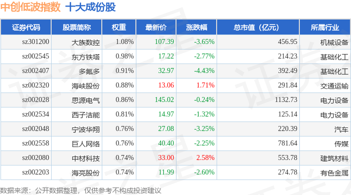 证券之星消息,12月2日,中创低波(399665)指数报收于2300.25点,跌0.92%,成交933.82亿元,换手率1.13%。当日该指数成份股中,上涨的有43家,金风科技以4.19%的涨幅领涨,下跌的有153家,森马服饰以6.29%的跌幅领跌。