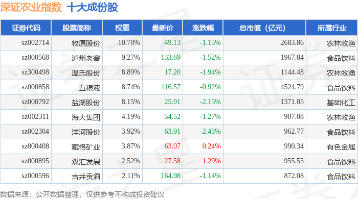 证券之星消息,12月2日,深证农业(399669)指数报收于8518.49点,跌1.12%,成交159.11亿元,换手率1.11%。当日该指数成份股中,上涨的有13家,三全食品以2.58%的涨幅领涨,下跌的有37家,新诺威以3.37%的跌幅领跌。