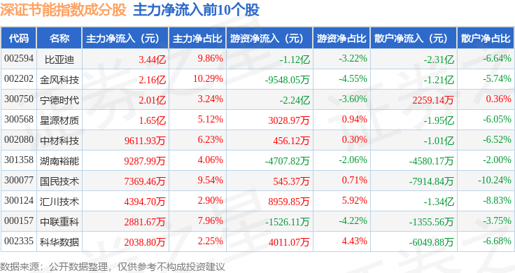 资金流向方面,深证节能(399695)指数成份股当日主力资金净流出合计41.59亿元,游资资金净流入合计4.0亿元,散户资金净流入合计37.59亿元。成份股资金流向详情见下表: