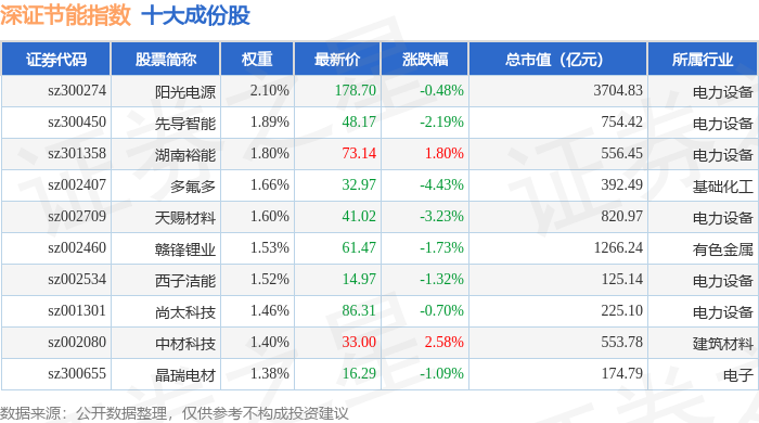 证券之星消息,12月2日,深证节能(399695)指数报收于2834.88点,跌1.15%,成交802.89亿元,换手率1.52%。当日该指数成份股中,上涨的有20家,星源材质以5.13%的涨幅领涨,下跌的有79家,英杰电气以6.21%的跌幅领跌。