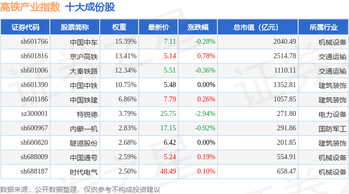 高铁产业(399807)指数十大成份股详情如下: