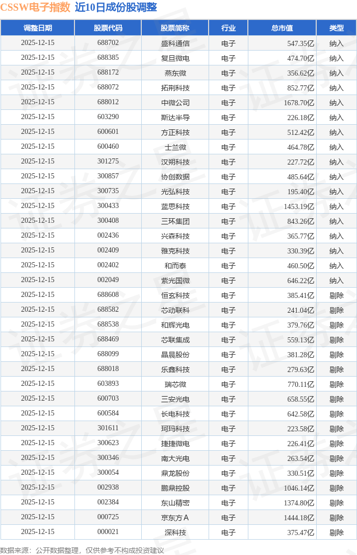 近10日内CSSW电子(399811)指数成份股做了调整,新纳入了17只股票,剔除了17只股票。