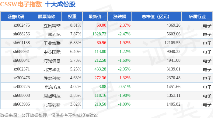 证券之星消息,12月2日,CSSW电子(399811)指数报收于5458.15点,跌0.81%,成交1141.84亿元,换手率1.57%。当日该指数成份股中,上涨的有13家,领益智造以3.31%的涨幅领涨,下跌的有46家,芯原股份以7.13%的跌幅领跌。