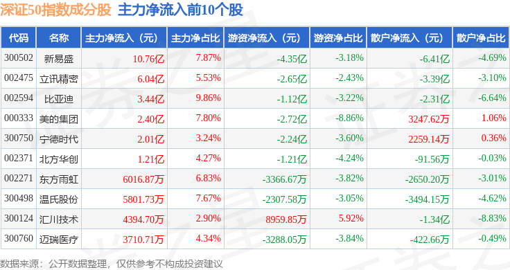 资金流向方面,深证50(399850)指数成份股当日主力资金净流出合计45.94亿元,游资资金净流入合计9.9亿元,散户资金净流入合计36.04亿元。成份股资金流向详情见下表:
