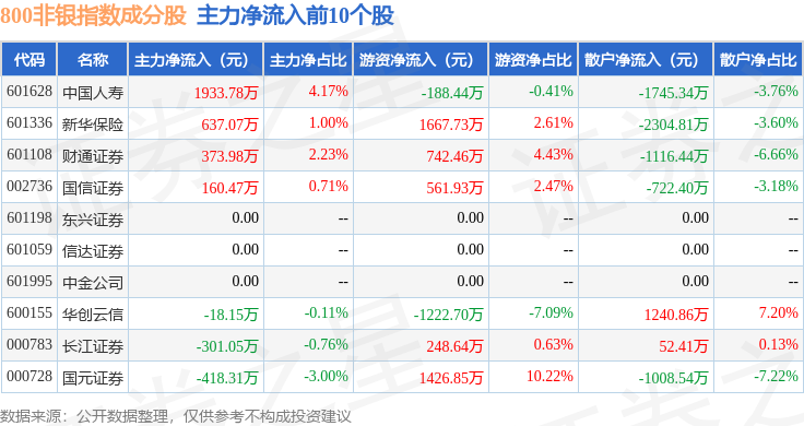 资金流向方面,800非银(399966)指数成份股当日主力资金净流出合计26.58亿元,游资资金净流入合计8.53亿元,散户资金净流入合计18.06亿元。成份股资金流向详情见下表: