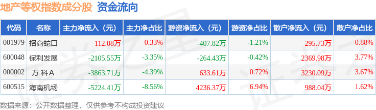 资金流向方面,地产等权(399983)指数成份股当日主力资金净流出合计1.11亿元,游资资金净流入合计4197.74万元,散户资金净流入合计6883.84万元。成份股资金流向详情见下表: