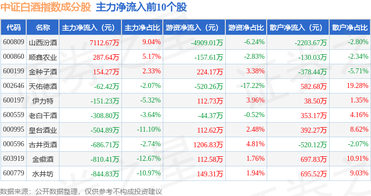 资金流向方面,中证白酒(399997)指数成份股当日主力资金净流出合计11.85亿元,游资资金净流入合计6.56亿元,散户资金净流入合计5.29亿元。成份股资金流向详情见下表: