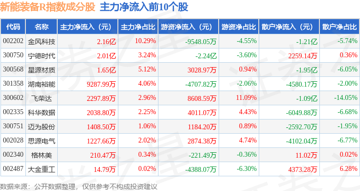 资金流向方面,新能装备R(470043)指数成份股当日主力资金净流出合计28.56亿元,游资资金净流入合计3.35亿元,散户资金净流入合计25.21亿元。成份股资金流向详情见下表: