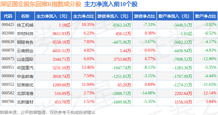 资金流向方面,深证国企股东回报R(470064)指数成份股当日主力资金净流出合计7.69亿元,游资资金净流入合计6796.6万元,散户资金净流入合计7.01亿元。成份股资金流向详情见下表: