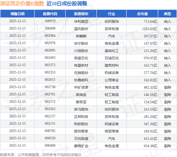 近10日内深证民企价值R(470072)指数成份股做了调整,新纳入了9只股票,剔除了9只股票。