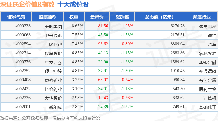 资金流向方面,深证民企价值R(470072)指数成份股当日主力资金净流出合计40.94亿元,游资资金净流入合计7.21亿元,散户资金净流入合计33.74亿元。成份股资金流向详情见下表: