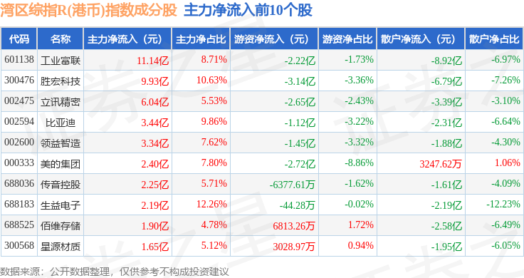 资金流向方面,湾区综指R(港币)(480004)指数成份股当日主力资金净流出合计57.93亿元,游资资金净流入合计18.58亿元,散户资金净流入合计38.88亿元。成份股资金流向详情见下表:
