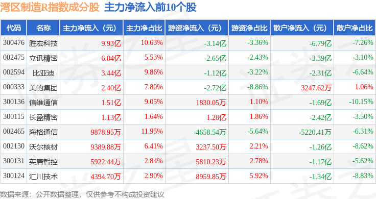 资金流向方面,湾区制造R(480009)指数成份股当日主力资金净流出合计61.7亿元,游资资金净流入合计17.93亿元,散户资金净流入合计43.77亿元。成份股资金流向详情见下表: