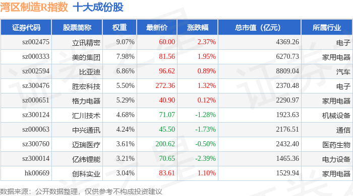 湾区制造R(480009)指数十大成份股详情如下: