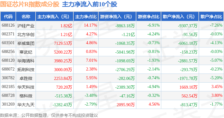 资金流向方面,国证芯片R(480017)指数成份股当日主力资金净流出合计31.57亿元,游资资金净流入合计8.38亿元,散户资金净流入合计23.19亿元。成份股资金流向详情见下表: