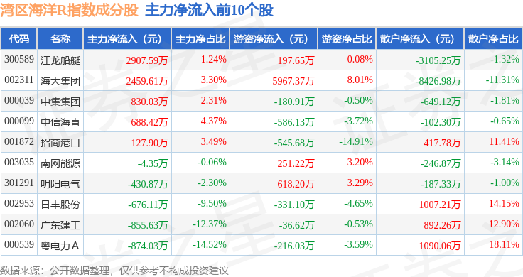 资金流向方面,湾区海洋R(480019)指数成份股当日主力资金净流入合计1111.97万元,游资资金净流入合计5150.07万元,散户资金净流出合计6262.04万元。成份股资金流向详情见下表:
