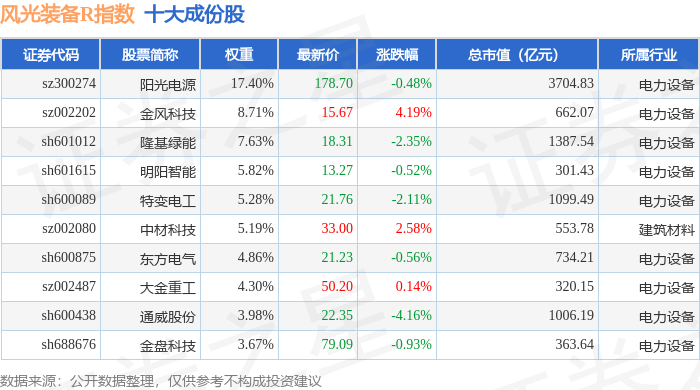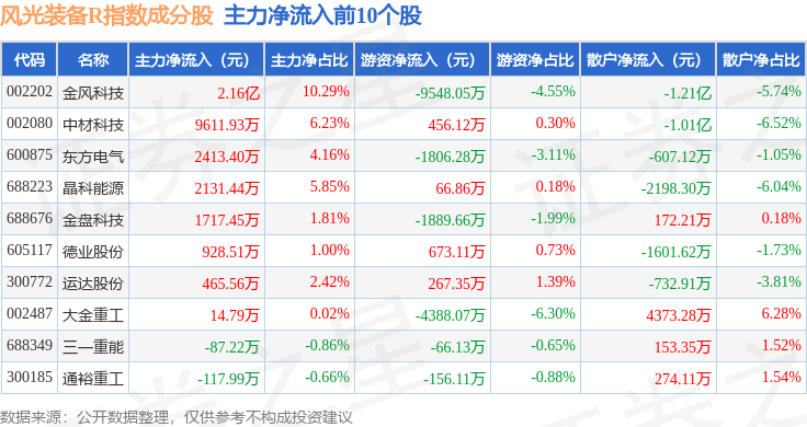 资金流向方面,风光装备R(480026)指数成份股当日主力资金净流出合计17.26亿元,游资资金净流入合计2.23亿元,散户资金净流入合计15.04亿元。成份股资金流向详情见下表:
