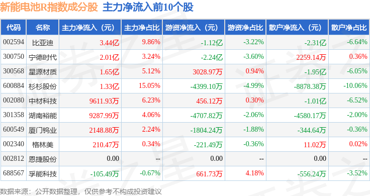 资金流向方面,新能电池R(480032)指数成份股当日主力资金净流出合计25.75亿元,游资资金净流出合计1460.77万元,散户资金净流入合计25.43亿元。成份股资金流向详情见下表: