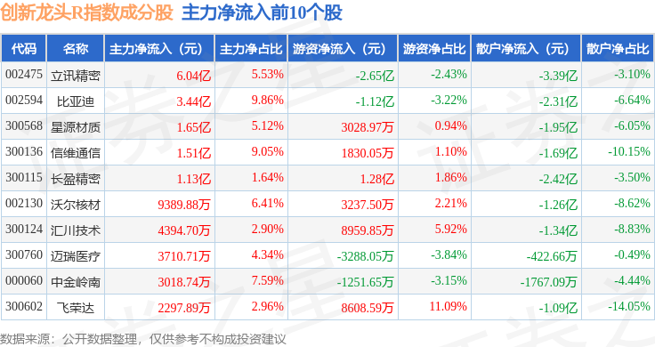 资金流向方面,创新龙头R(480036)指数成份股当日主力资金净流出合计58.05亿元,游资资金净流入合计23.25亿元,散户资金净流入合计34.8亿元。成份股资金流向详情见下表: