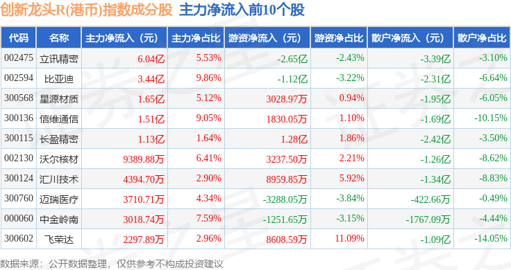 资金流向方面,创新龙头R(港币)(480037)指数成份股当日主力资金净流出合计58.05亿元,游资资金净流入合计23.25亿元,散户资金净流入合计34.8亿元。成份股资金流向详情见下表: