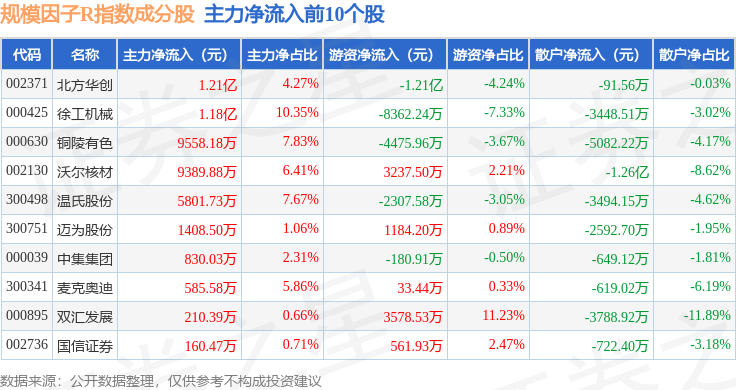 资金流向方面,规模因子R(480055)指数成份股当日主力资金净流出合计52.83亿元,游资资金净流入合计16.1亿元,散户资金净流入合计36.72亿元。成份股资金流向详情见下表: