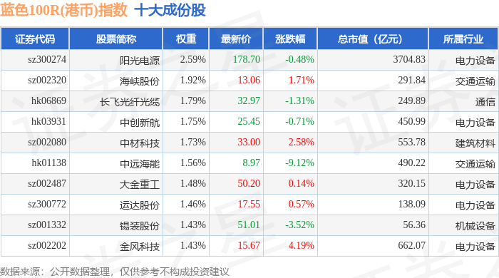 蓝色100R(港币)(480069)指数十大成份股详情如下: